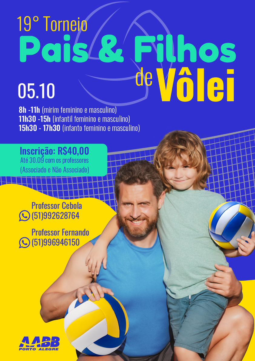 No 19º Torneio Pais & Filhos de Vôlei, cada saque, cada ponto e abraço celebrará a parceria, a amizade e o fortalecimento dos laços familiares. O evento será no dia 5 de outubro, nos seguintes horários: