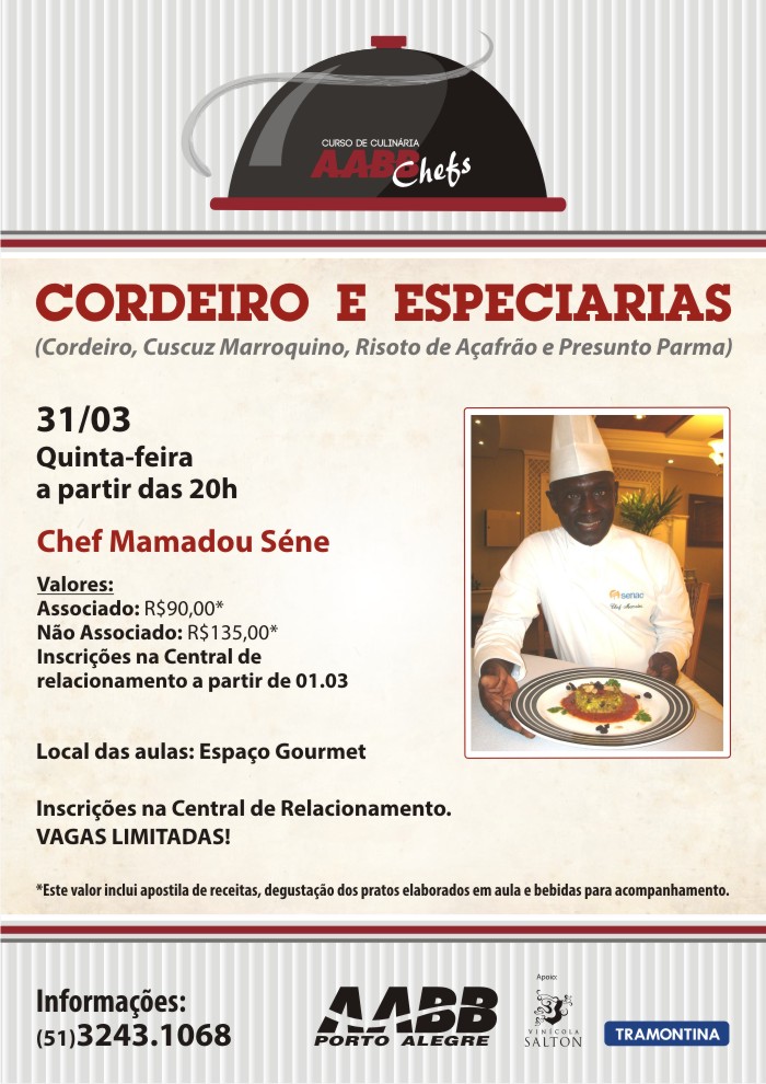 O primeiro curso rápido de gastronomia de 2016 já tem data marcada e acontecerá no dia 31 de março, às 20h, no Espaço Gourmet do Clube. Com o tema Cordeiro e Especiarias, o Chef Mamadou Sené passará dicas sobre Cordeiro, Cuscuz Marroquino, Risoto de Açafrão e Presunto Parma. O valor da aula para associados é R$ 90,00 e, não associados, pagam R$ 135,00. As incrições poderão ser feitas a partir do dia 1º, na Central de Relacionamento abebeana. Informações pelo telefone (51) 3243.1068.