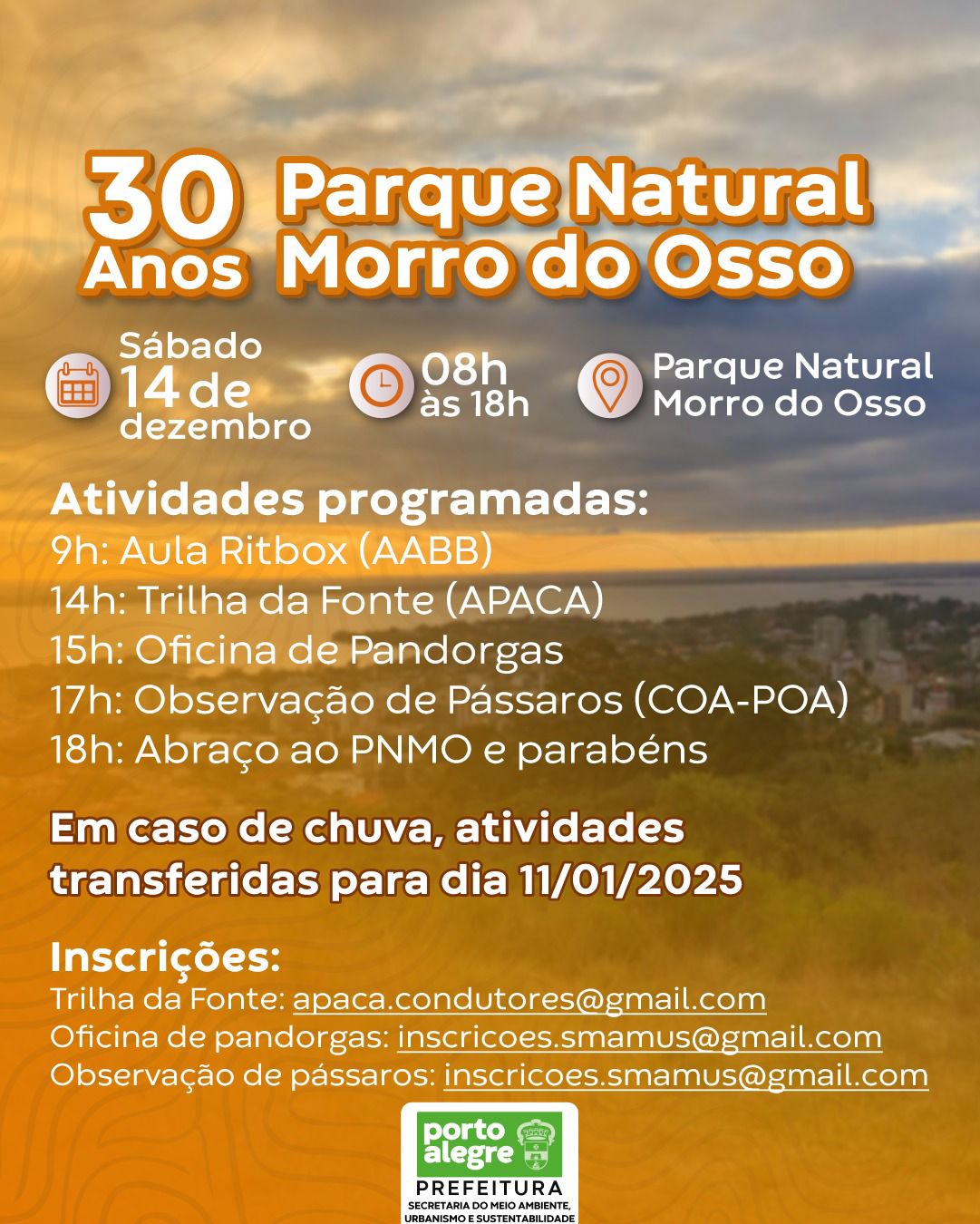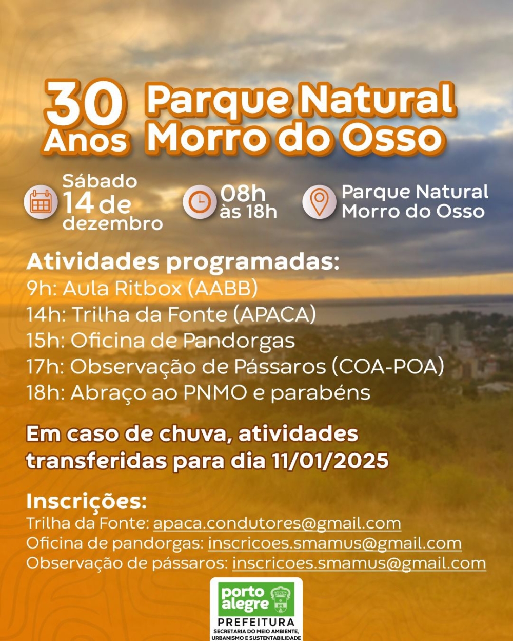 O Parque Natural Morro do Osso está completando 30 anos e no próximo sábado, 14 de dezembro, das 8h às 18h, no próprio Parque, ocorrerão atividades para celebrar uma das áreas naturais mais importantes de Porto Alegre. A AABB irá marcar presença nesta data com uma aula de Ritbox com o professor Everton. Confira a programação completa: