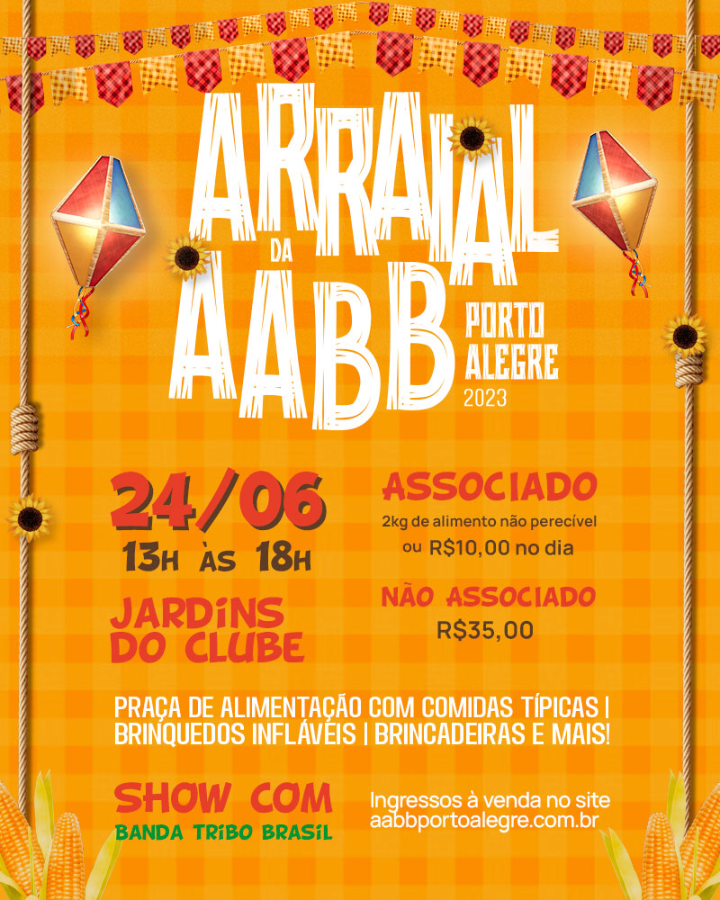 Basta o mês de junho se aproximar que o brasileiro não vê a hora de curtir a festa mais popular do país. O tradicional Arraial da AABB Porto Alegre ocorrerá no dia 24 de junho, das 13h às 18h nos Jardins do Clube. Para curtir esta celebração, os associados podem adquirir o ingresso trazendo 2kg de alimento não perecível em boas condições de uso e dentro prazo de validade, ou R$10,00 no dia do evento. Não associados que quiserem vir prestigiar poderão garantir o seu ingresso por R$35,00. Os ingressos estarão à venda no site aabbportoalegre.com.br. Além da tradicional praça de alimentação com comidas típicas, brinquedos infláveis e brincadeiras, teremos um show com a Banda Tribo Brasil. Informações pelo whatsapp: 51 3243.1000