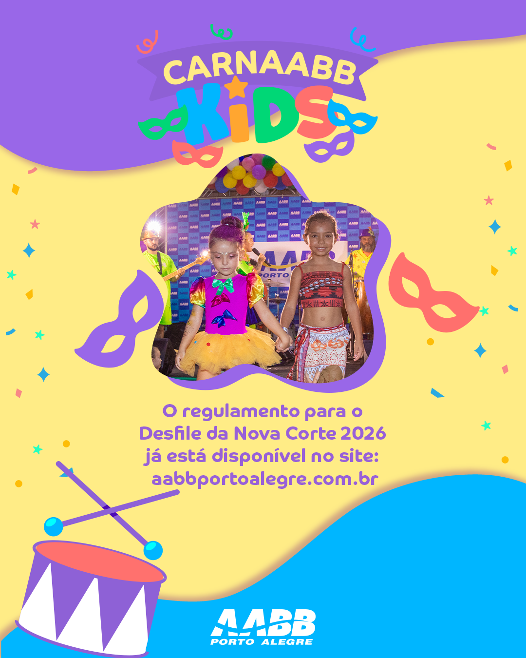 Ainda faltam algumas semanas para o CarnAABB Kids 2026, mas a ansiedade já está no ar! Em breve vamos descobrir quem será o novo Rei e a nova Rainha. Para ninguém ficar de fora do ritmo, disponibilizamos no site o regulamento completo com todas as informações sobre como vai funcionar a escolha da nossa Corte Kids. Clique aqui e confira!