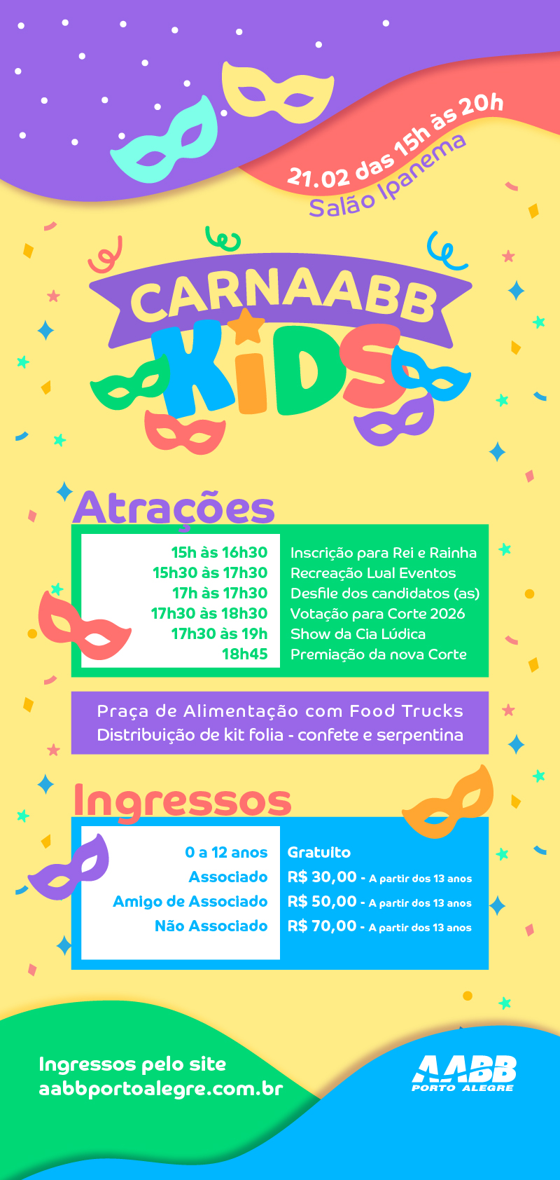 O CarnAABB Kids acontecerá no dia 21 de fevereiro, das 15h às 20h, no Salão Ipanema. Vai ter muita diversão com Kit Folia, cheio de confete e serpentina, músicas carnavalescas para todo mundo dançar e brincar, além do animado Concurso da Nova Corte 2026, onde a alegria subirá ao trono!