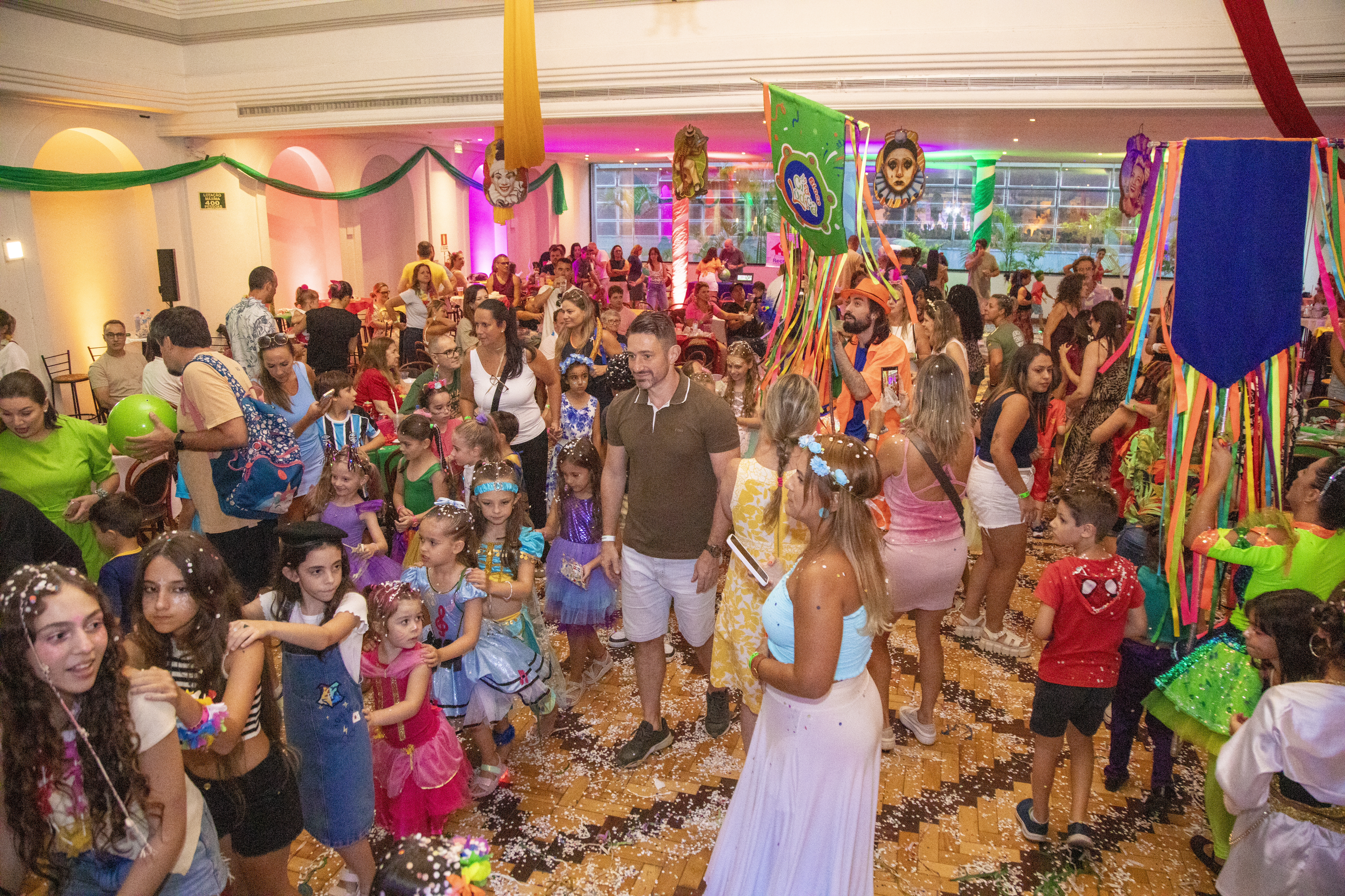 Logo na chegada, os pequenos foliões receberam o Kit Folia, com serpentinas e confetes, garantindo que ninguém ficasse de fora da brincadeira. Bastava abrir a embalagem e a festa já começava ali mesmo.