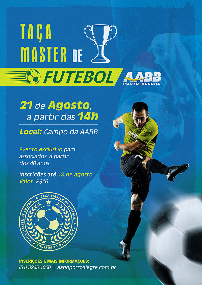 Essa é para os atletas abebeanos com mais de 40 anos! A AABB Porto Alegre promove um evento esportivo dedicado aos jogadores mais experientes. A competição acontecerá no dia 21 de agosto, no campo de futebol do Clube. As inscrições podem ser feitas até o dia 18 de agosto pelo valor de R$ 10. Mais informações pelo telefone 3243.1000.