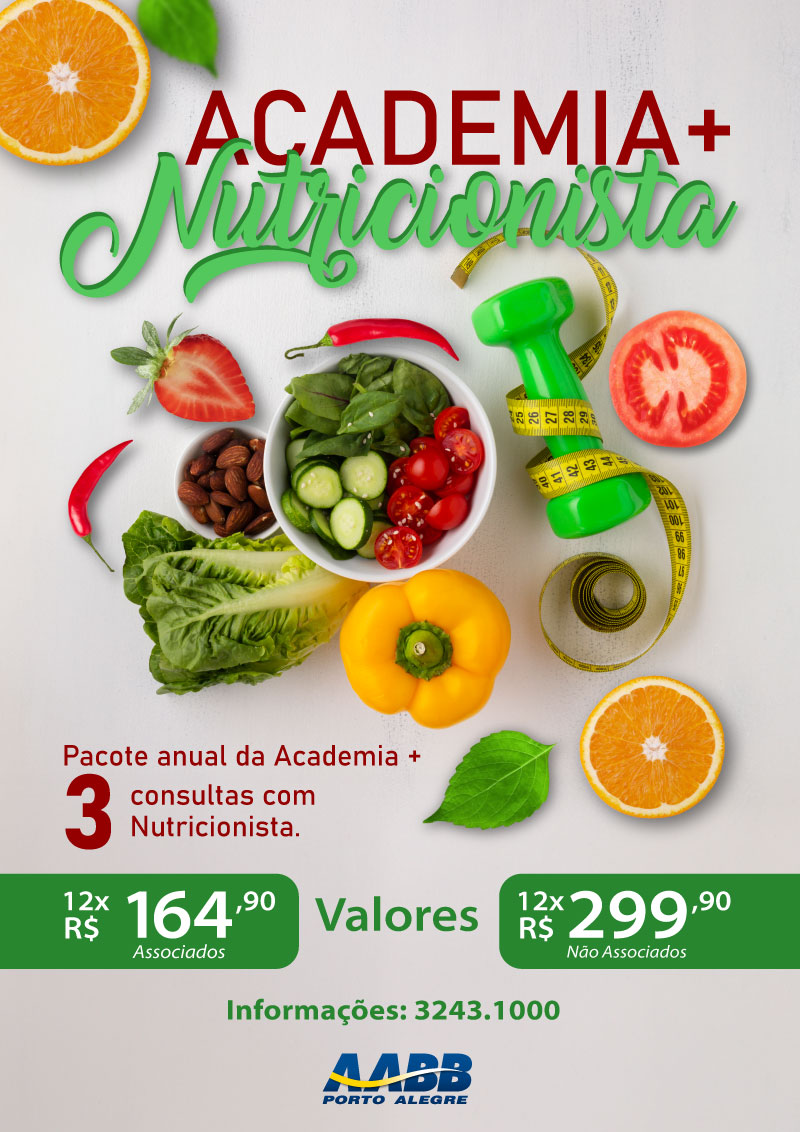 Desta forma, a AABB Porto Alegre está lançando o plano Academia+Nutricionista. No pacote anual da Academia + 3 consultas com Nutricionista, o valor é de 12x de R$164,90 para Associados. Aos não associados, que frequentam a academia e desejam adquirir o pacote, o valor será de 12x de 299,90.