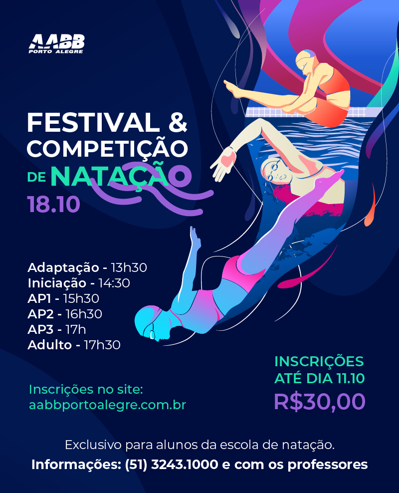 Muito mais que um evento, é uma oportunidade de incentivar a prática esportiva, o aprendizado e a evolução dos atletas dentro d’água. O Festival & Competição de Natação ocorrerá no dia 18 de outubro, com a seguinte programação:Adaptação - 13h30minIniciação - 14h30minAP1 - 15h30minAP2 - 16h30minAP3 - 17hAdulto - 17h30minAs inscrições deverão ser feitas até o dia 11 de outubro, no site: aabbportoalegre.com.br, no valor de R$30,00. Lembrando que o evento é exclusivo para alunos da escola de natação. Mais informações pelo (51) 3243.1000 ou diretamente com os professores.