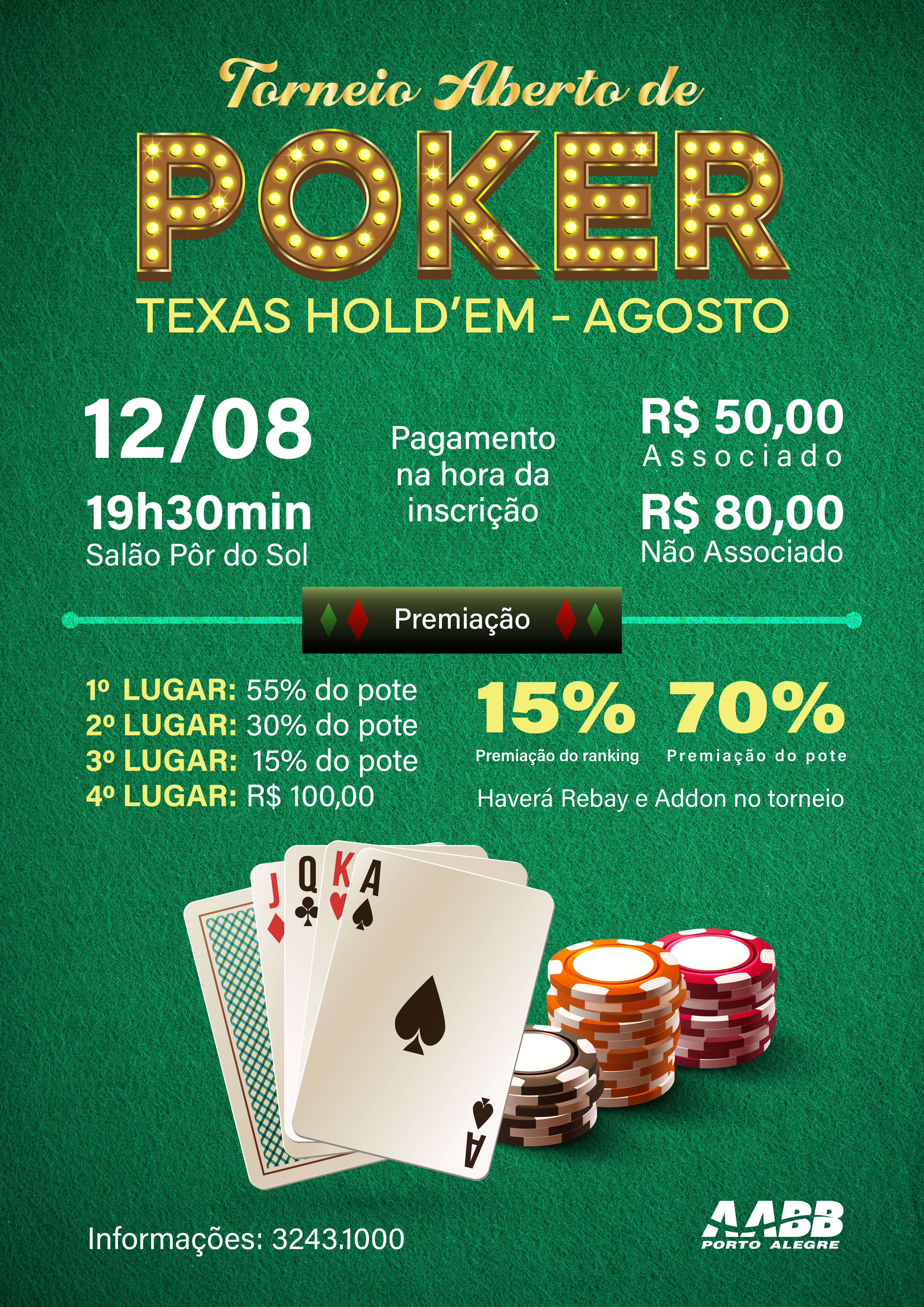 O Torneio Aberto de Poker Texas Hold'em está de volta para mais uma rodada repleta de blefes, estratégias e jogadas épicas. A etapa de agosto acontecerá no dia 12, às 19h30min, no Salão Pôr do Sol. As insctições serão realizadas no dia do evento, com valor de R$50,00 para associados e R$80,00 para não associados.