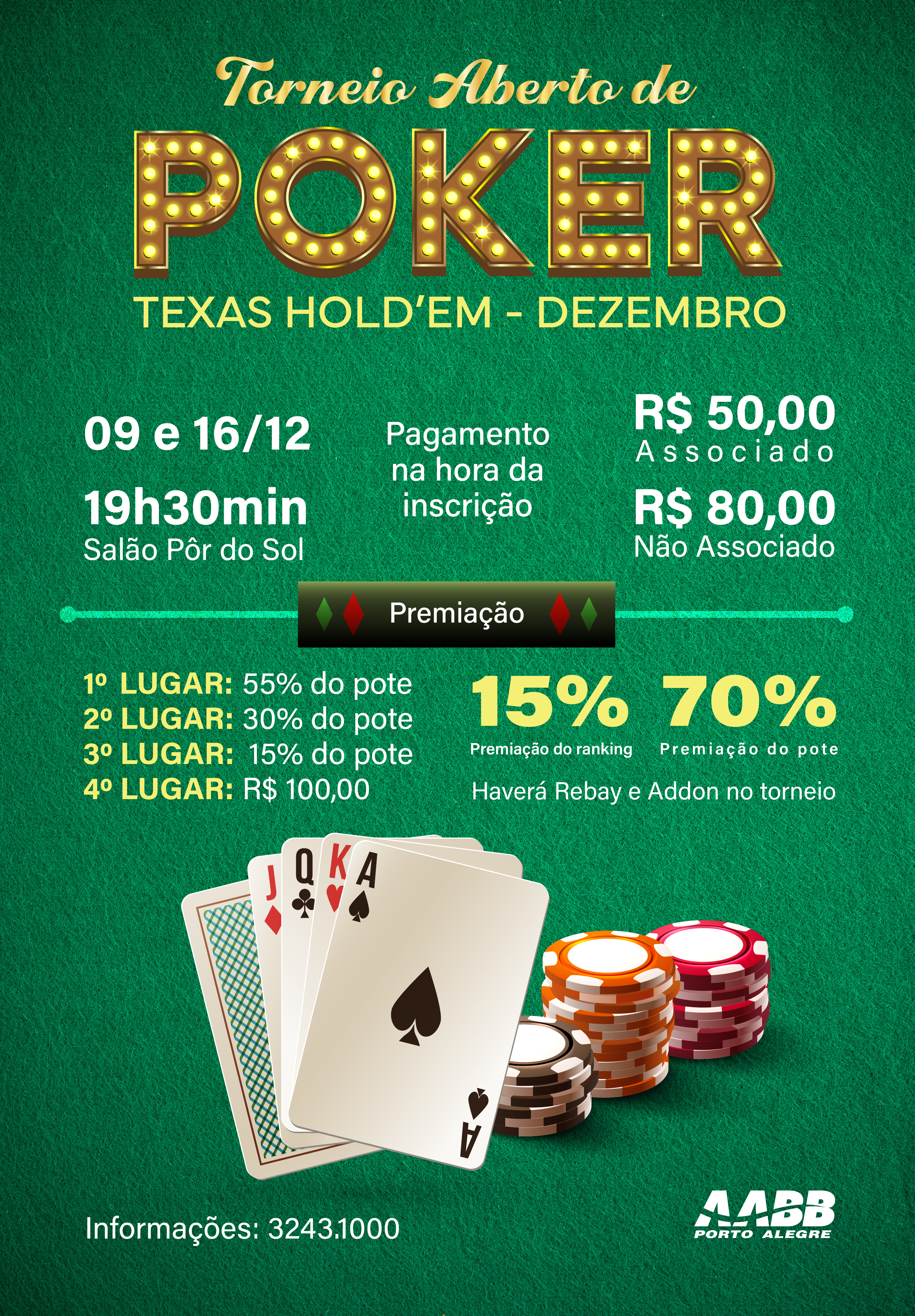 O Torneio Aberto de Poker – Texas Hold’em está de volta para fechar o ano com muita emoção, blefes calculados e estratégias afiadas!