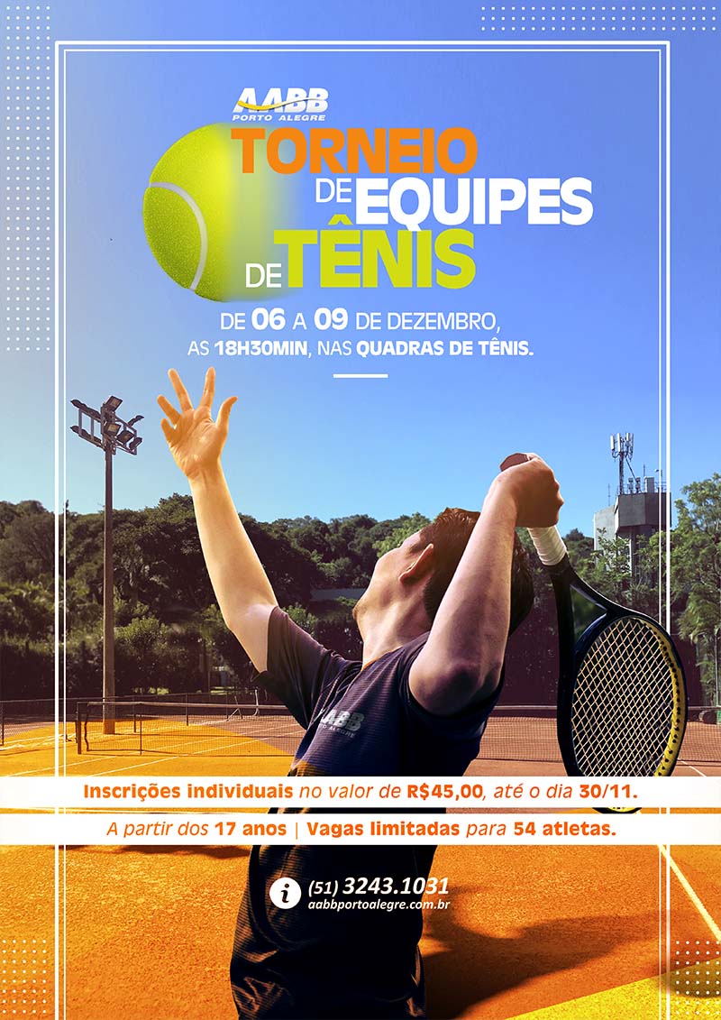 A AABB Porto Alegre promove uma competição especial para os tenistas com idade superior a 17 anos. O Torneio de Equipes de Tênis acontecerá dos dias 06 a 09 de dezembro, às 18h30min, nas quadras de tênis. As inscrições podem ser realizadas até o dia 30 de novembro e o valor individual é de R$ 45,00. Mas corra, pois as vagas são limitadas para até 54 atletas. Mais informações diretamente com o Departamento de Esportes pelo telefone 3243.1031.